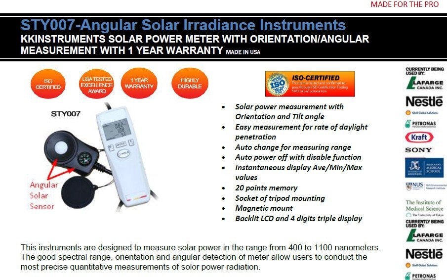 This instruments are designed to measure solar power in the range from 400 to 1100 nanometers. The good spectral range, orientation and angular detection of meter allow users to conduct the most precise quantitative measurements of solor power radiation.
